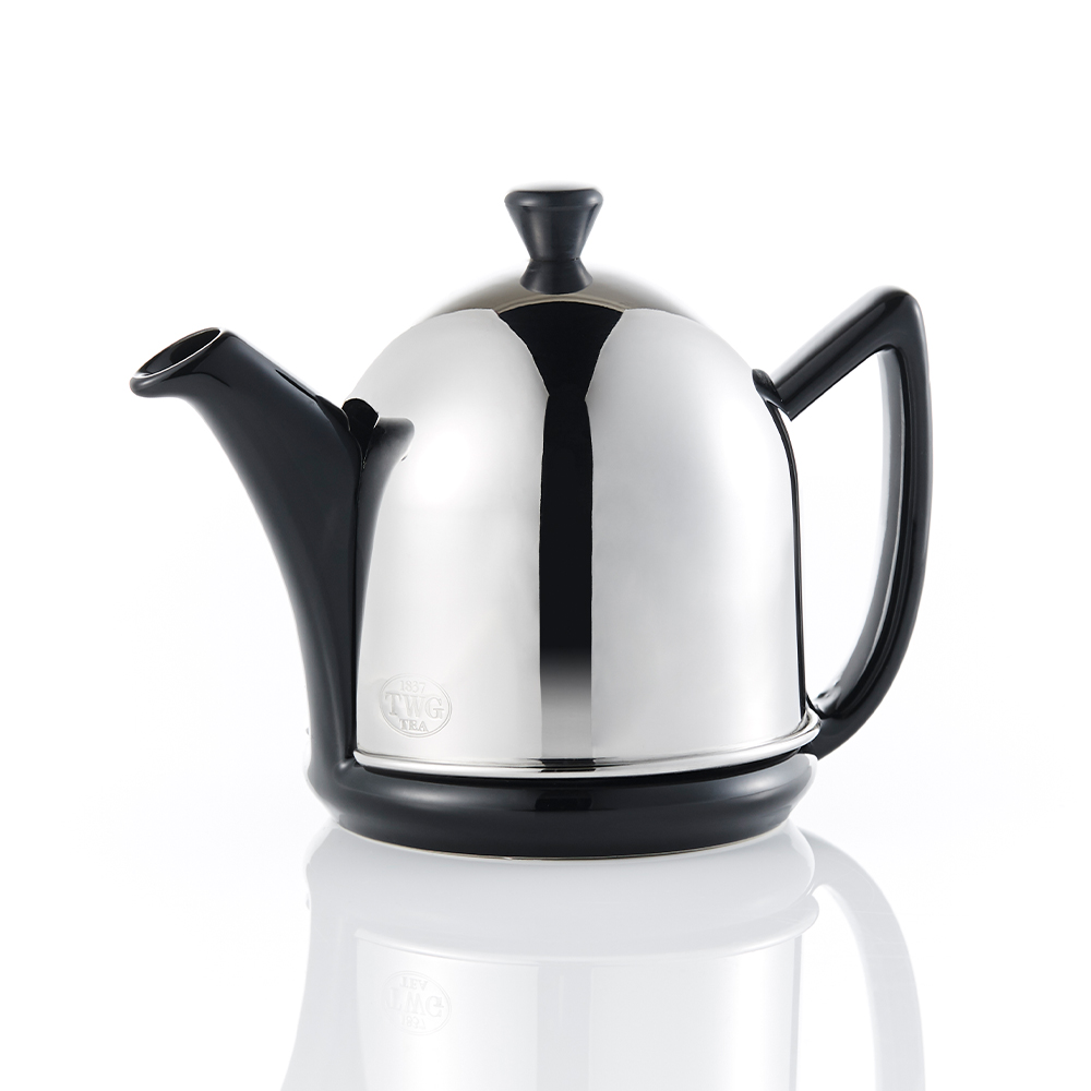 The TWG Tea Dome teapots feature a high-quality polished warmer in either stainless steel or metallic golden rose with an inner felt lining which fits over the porcelain teapot and keeps the tea warm. These ceramic teapots come with a specially designed removable filter which allows the leaves to unfurl and to develop their fragrance during the infusion. This teapot is perfectly suitable for all tea varieties.